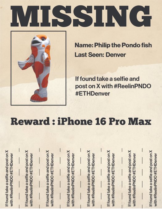 MISSING: PHILIP THE PONDO FISH 🚨 Last seen wandering around Denver looking for alpha and sushi. 🍣👀 If found, please take a selfie and post on X with #ReelinPNDO and #ETHDenver 👀 REWARD: iPhone 16 Pro Max 🤑