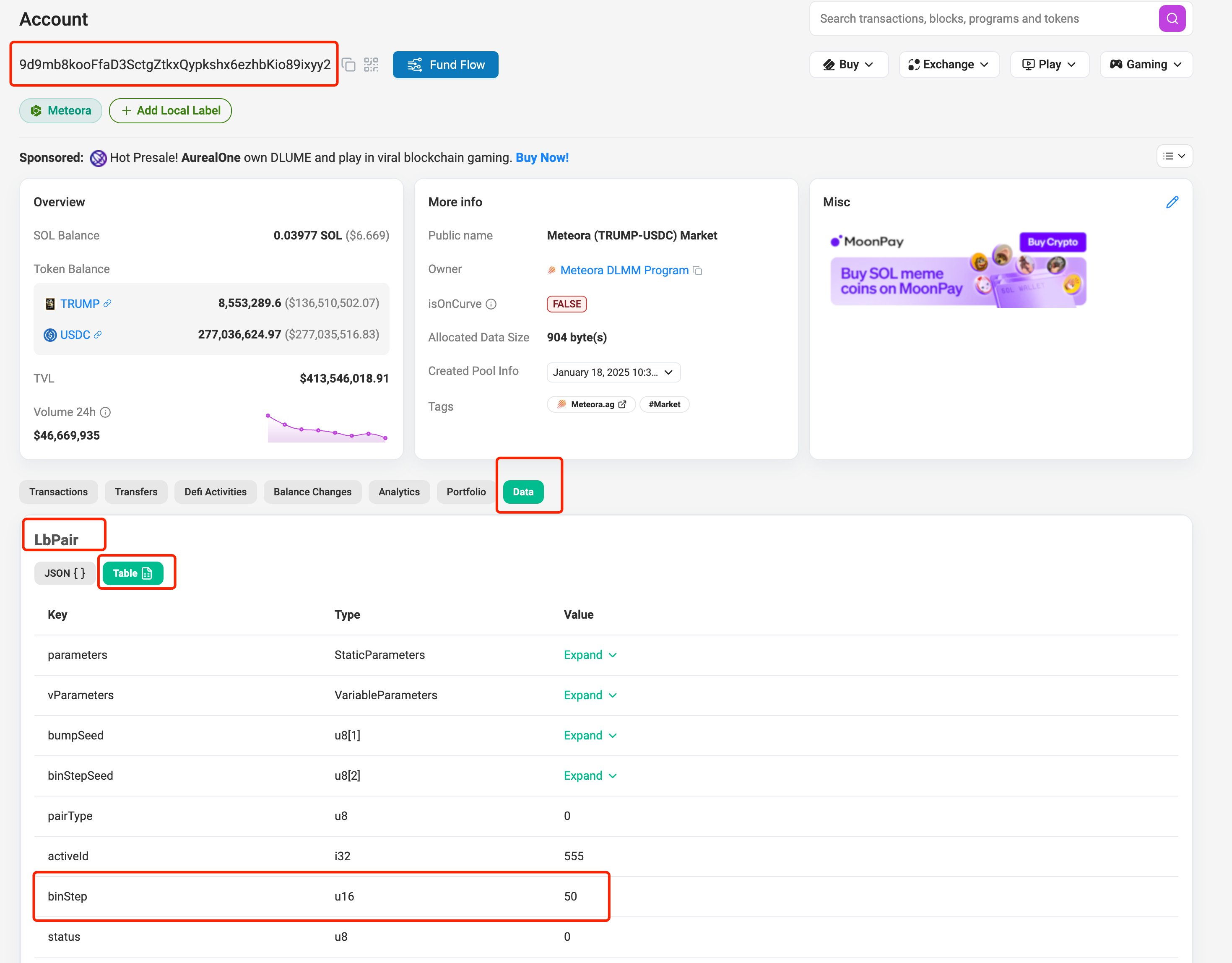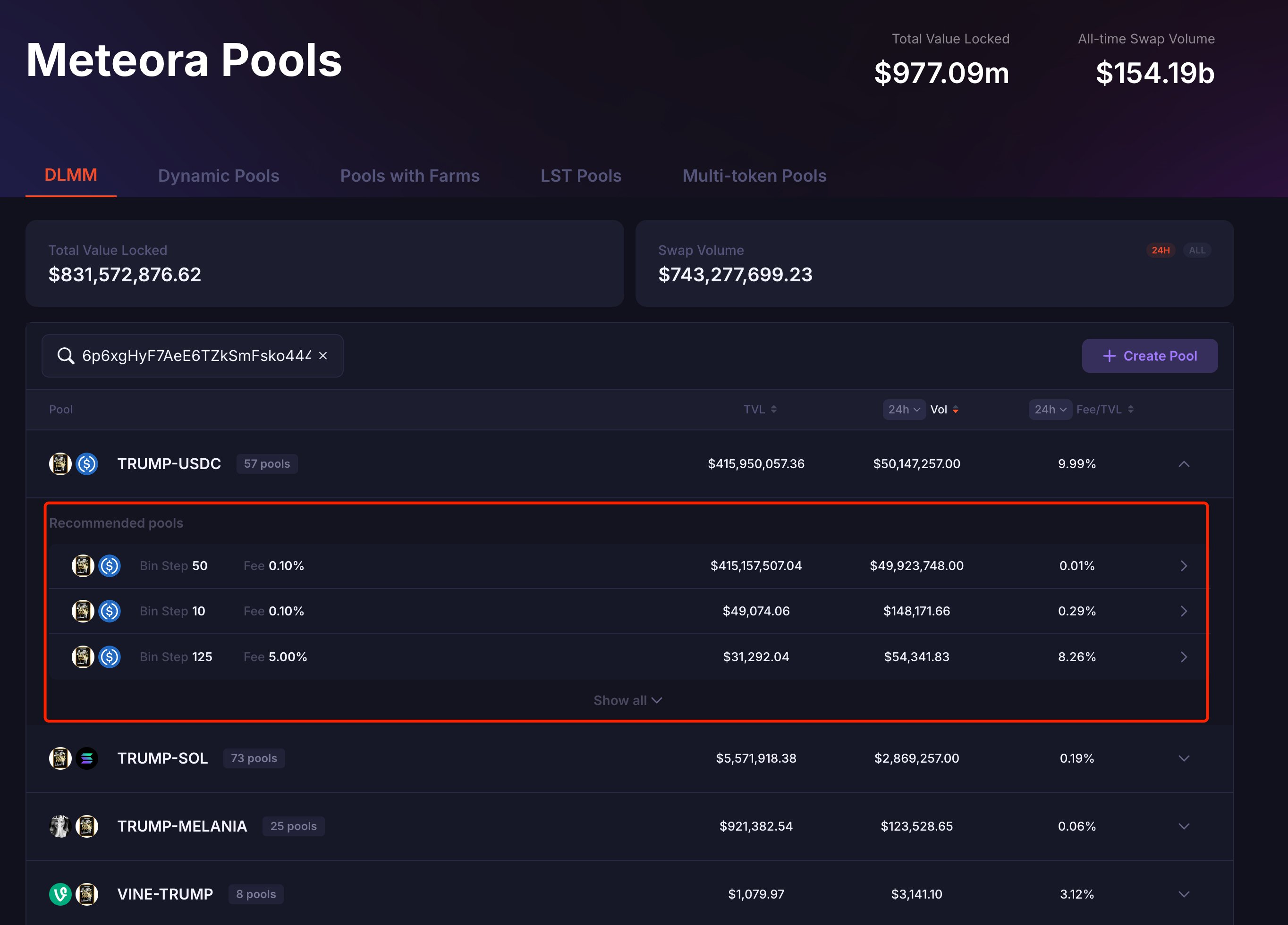 Each trading pair can have multiple Pools, and each Pool is distinguished by Bin Step and Fee (handling fee). For example, there are 57 Pools under the Trump-USD trading pair, and each Pool corresponds to a unique address, as shown in the figure.