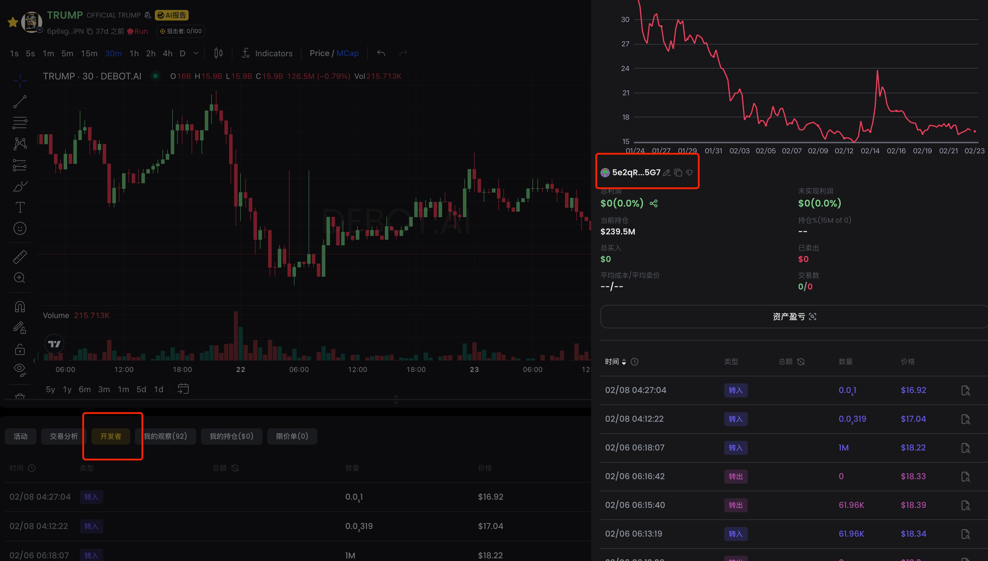 First, we open debot (https://debot.ai?inviteCode=175623) and enter the CA of $trump to find the address of dev 5e2qRc1DNEXmyxP8qwPwJhRWjef7usLyi7v5xjqLr5G7, as shown in the figure