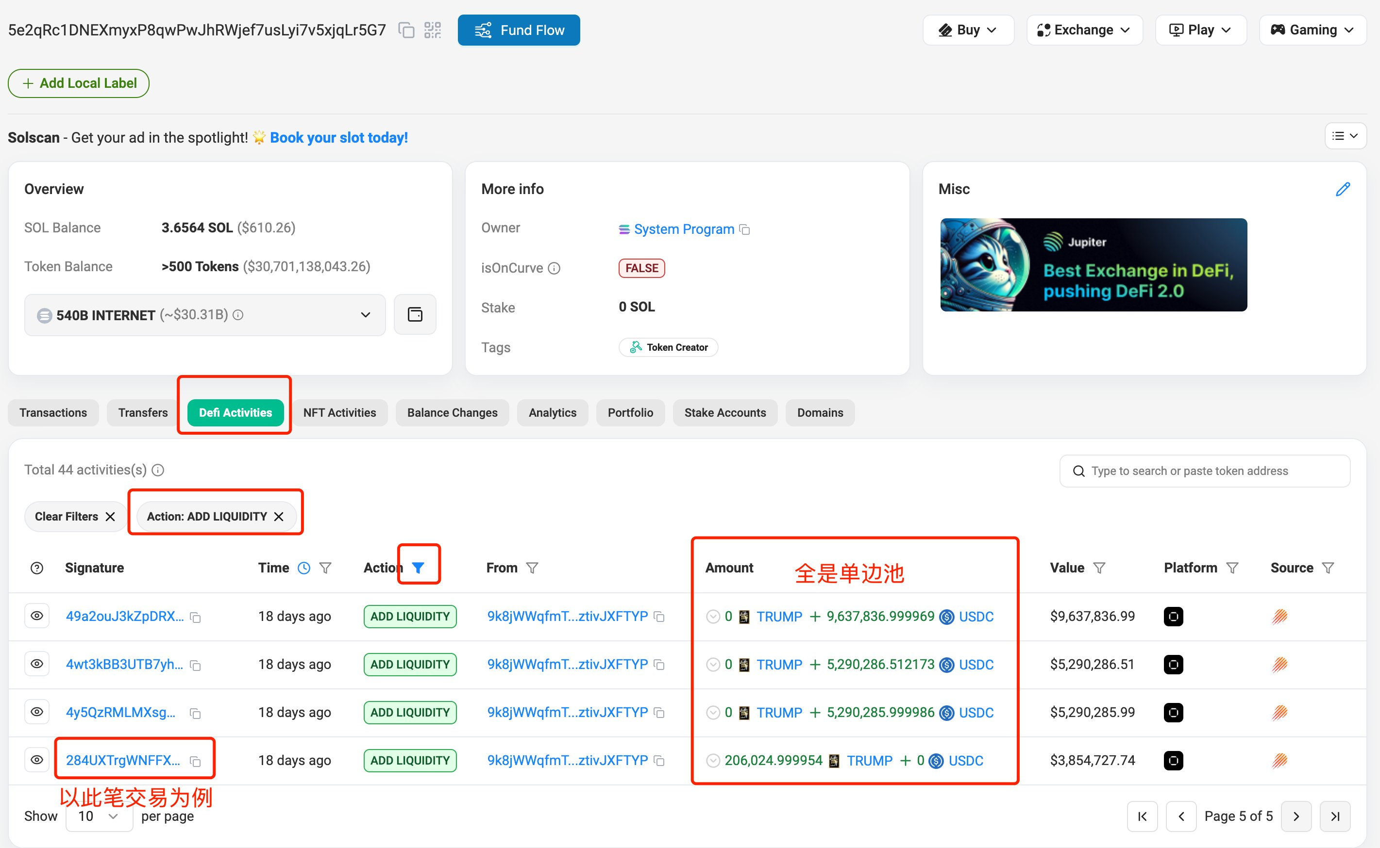 Open the last transaction in the above picture (https://solscan.io/tx/284UXTrgWNFFXTovbCAQsJA8U5mW4rntwa8KyRvSmhNYf7cus1rtskiVqwNkErdosDMUsJfxXm8KgkCf1DzTPmPr), check the transaction details, and you can see that this addition pool only adds $trump, as shown in the figure