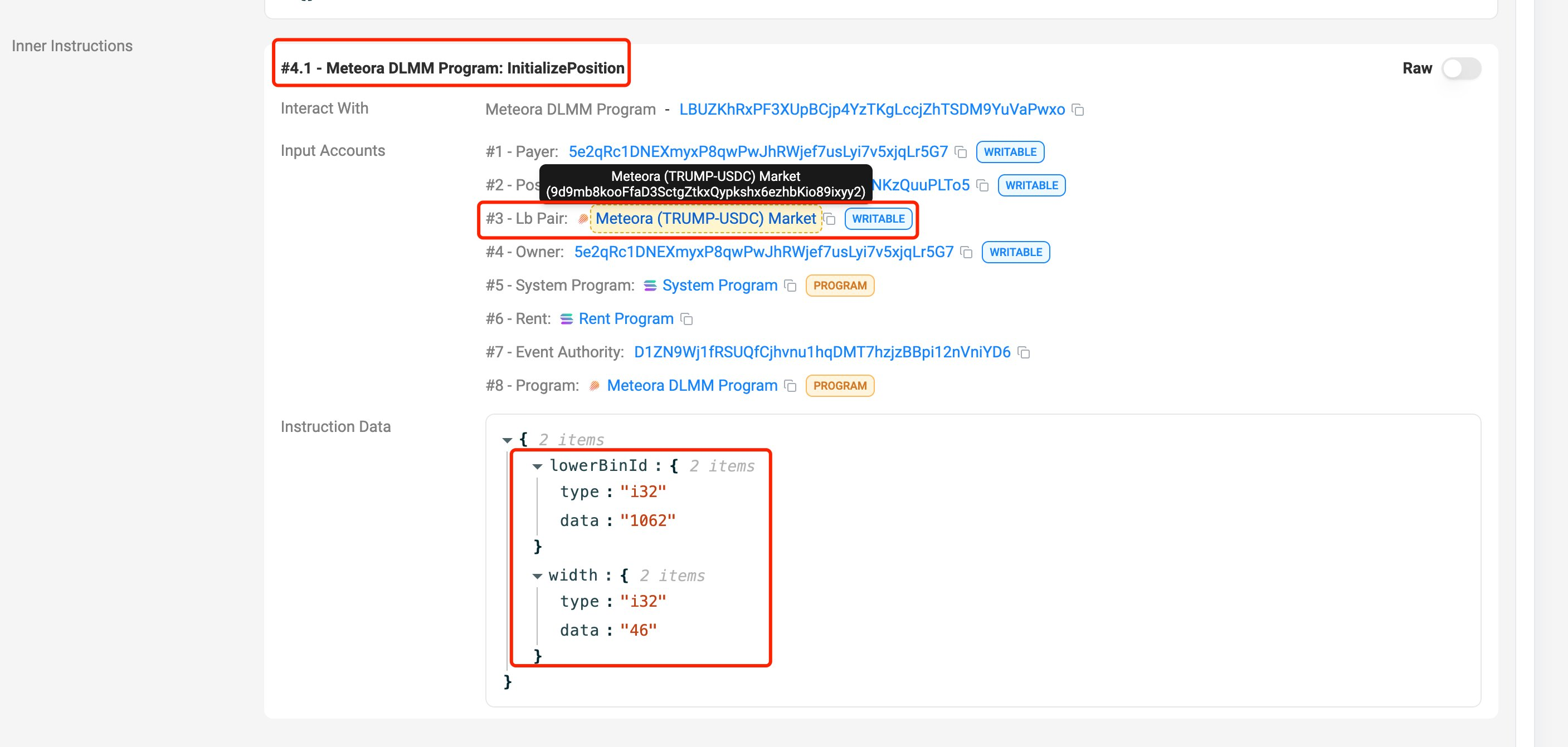 Scroll down on the transaction details page and you can see in [#4.1 - Meteora DLMM Program: initializePosition] that lowerBinId is 1062, the bin width (i.e. the number of bins) is 46, and the pool address is 9d9mb8kooFfaD3SctgZtkxQypkshx6ezhbKio89ixyy2, as shown in the figure.
