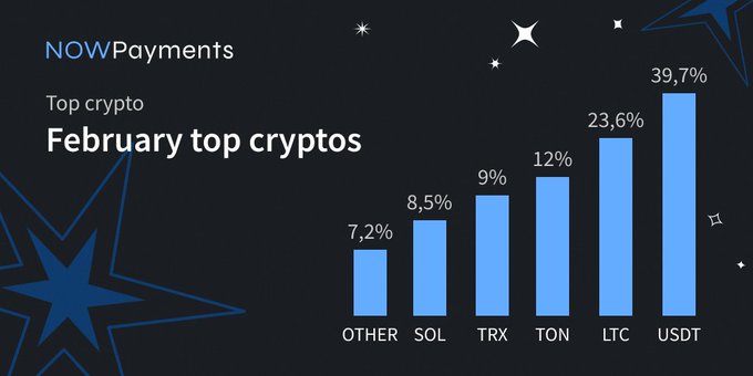 Top 3 most used cryptos for payments in February! 💰 $USDT on @Trondao – fast, stable and number ONE ⚡ $LTC @litecoin – still popular, despite recent dip 🔒 $TON and $USDT on @ton_blockchain – mass adoption leader! Which one did you accept the most? 👀