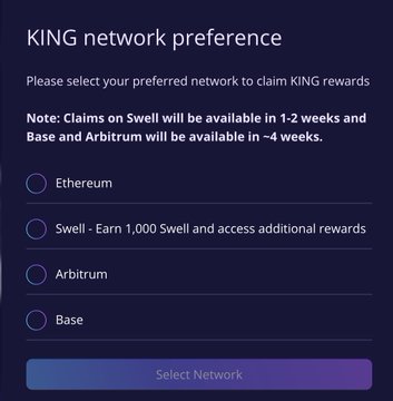 Earn a free $10-20 of Swell tokens from EtherFi EtherFi recently created a KING token which reflects an accumulation of your restaking rewards If you choose the Swell L2 as your claim network you will receive a free 1,000 $SWELL Steps: - Visit http:/app.ether.fi/portfolio - Select