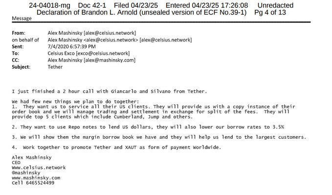 ⛔️👀 Tether tied to the Celsius ponzi scheme?😱 This email shows the fraud that props up the entire crypto market. Tether lends unlimited free $USDT printed from thin air to market manipulators, then backfill “reserves” from the collateral Like the Fed with permanent mega QE