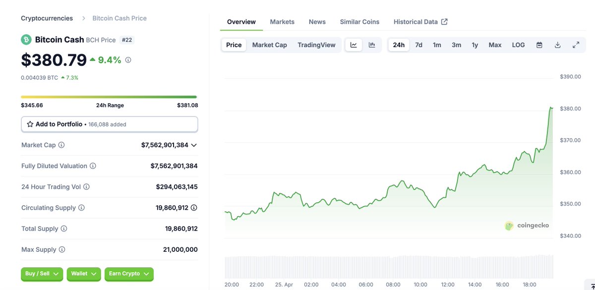 🚀 #BitcoinCash just ripped +9% to ~$380, out-performing the majors today. With the May 15 “VELMA” network upgrade less than a month away — boosting VM limits & paving the way for richer smart-contract apps — are we watching the first spark of a pre-upgrade rally? 🔥 $BCH