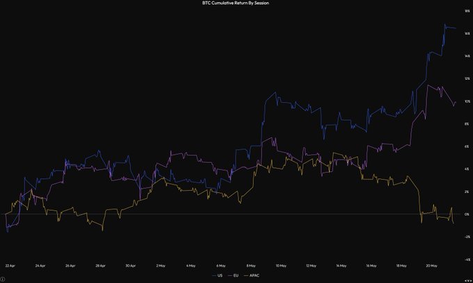 Most of $BTC's returns this month have come during the US & EU trading sessions. Meanwhile, the Asia session has been rather bearish and has been flat over the month and negative during the last week.