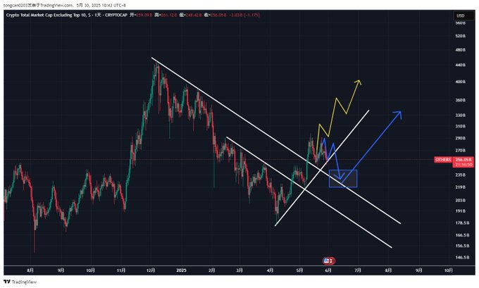 Here's the translation: Let me discuss the current and subsequent potential trends of altcoins $OTHERS, along with my personal trading strategy. On May 19th, last Monday, I shared with everyone my thoughts on the subsequent trends of altcoins and trading strategy. Either directly starting a yellow line main upward wave, or following the blue line to hit a secondary high point before starting a sustained oscillating adjustment. Subsequently, the market chose the blue line approach. I personally followed my trading plan and gradually closed out my previous medium and long-term long positions between May 24-26, and reduced my spot positions. This week was mainly about finding some strong altcoins for day trading. The next key focus is the adjustment method of the blue line segment. My current spot bottom position will remain unchanged, as long as the K-line during the oscillating adjustment does not break through the [white line support in the basket], the bullish trend remains intact. But this process will be quite challenging. Many weak altcoins might drop back to the starting point of May 8th, or even lower. So on May 19th, I reminded everyone that if there was no violent surge to new highs that week, but instead a secondary high point followed by a pullback, it would be best to reduce positions and push for profit protection. However, I also want to remind everyone that the current adjustment is a weekly pullback. As long as the white line support is not broken, the market may potentially restart an upward trend after rebounding to the white line support [after a "big wash"]. Therefore, I will continue to hold my spot bottom position. Once the upward trend restarts, I will immediately re-enter long positions. If it subsequently breaks below the [white line support in the basket], I will temporarily exit and observe. As always, don't try to predict the market, just analyze and extend possible market trends. Analyzing and extending different potential trends is not to prove who is right, but to prepare [one's own trading plan and response measures] in advance. During strong upward movements, take a broader approach and trade medium to long-term positions. During oscillating markets, be less ambitious and do some day trading. When the trend clearly ends and enters a bearish market, start shorting at high points. That's all. The above is for everyone's reference.