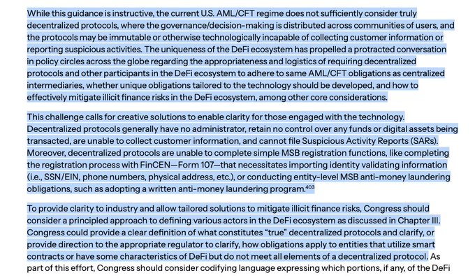 21/ If you love DeFi (guilty❣️), you should read p.106 if you read anything. The Report does a 🤯 job of actually laying out the challenges associated w imposing traditional AML regs w DeFi (snapshot below)