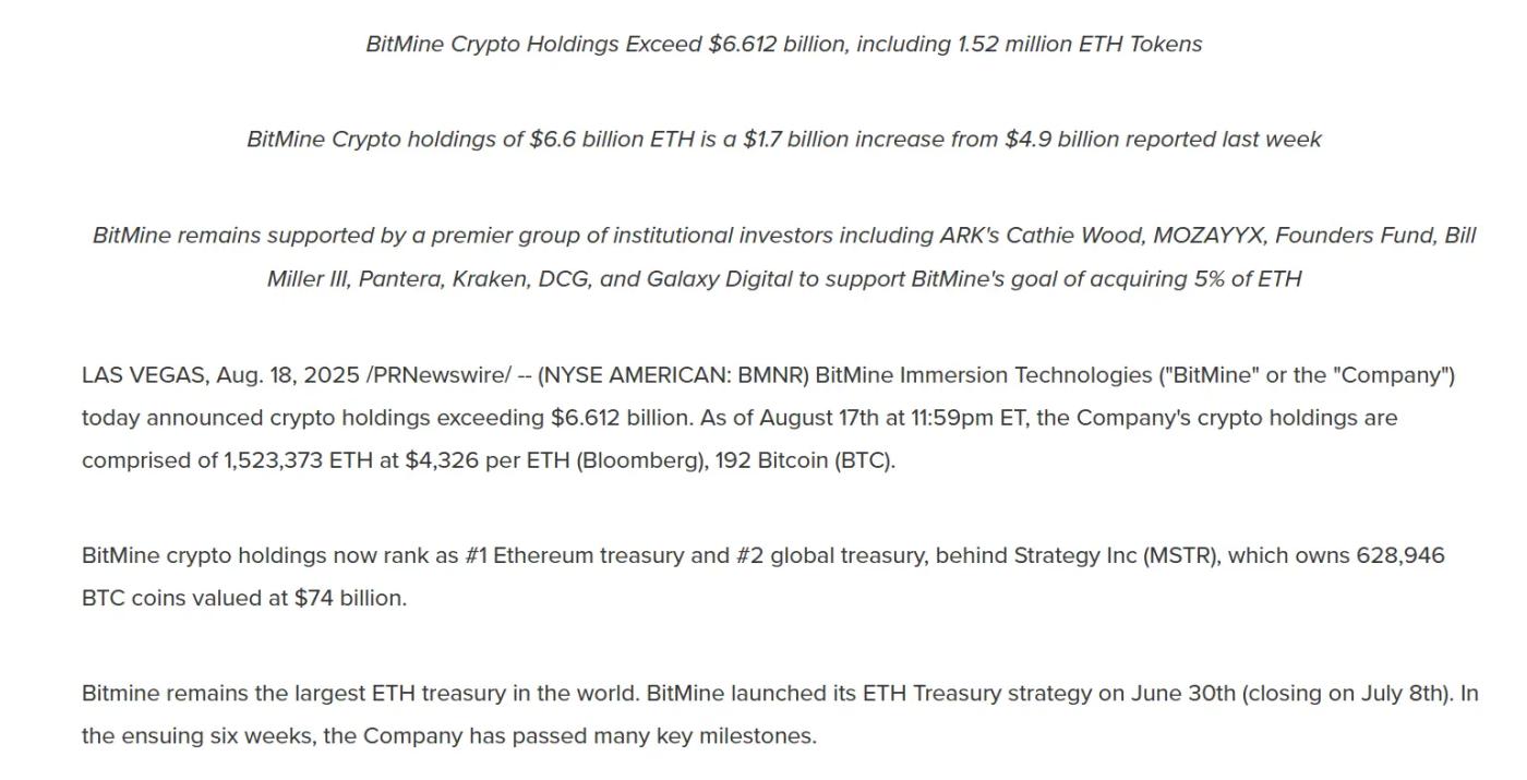 Take BitMine as an example. According to official disclosure, its crypto asset holdings have exceeded $6.612 billion, increasing by about $1.7 billion from the previous week's $4.9 billion. BitMine holds 1.523 million ETH (calculated at the current price of $4,326 per ETH), and also holds 192 BTC.