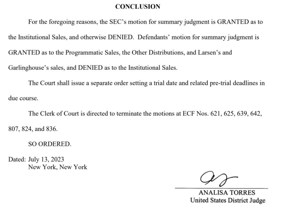 On July 13, 2023 , Judge Analisa Torres granted partial summary judgment :