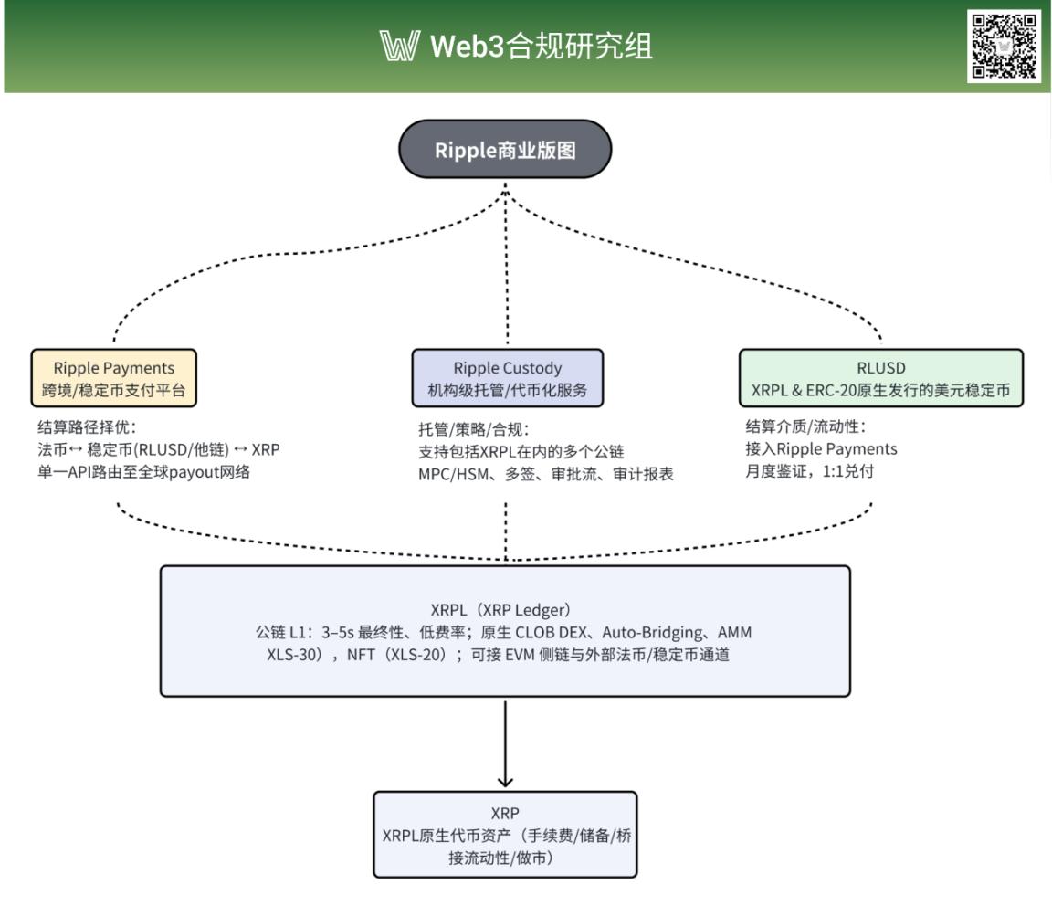 Today, Ripple, with the XRP Ledger public chain (XRPL) as its underlying technology stack and XRP as the native liquidity and fee asset of XRPL , provides comprehensive and systematic financial services including Ripple Payments cross-border payment settlement, Ripple Custody digital asset custody and tokenization, and the stablecoin RLUSD .
