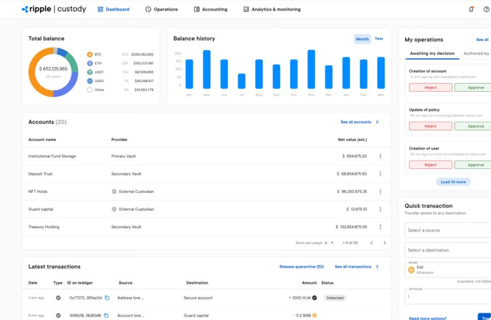 Ripple Custody is an institutional-grade digital asset custody solution for banks, custodians, exchanges, and large enterprises. Custody is the foundation of digital asset businesses, providing underlying security support for institutional use cases such as tokenization, stablecoin issuance, and digital asset management. Ripple Custody combines MPC/HSM key management, tiered hot and cold wallets, strategic approvals/authorizations, audit reporting, and compliance modules . Deployable on-premises or in the cloud , it offers customized custody services for institutions.