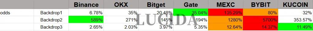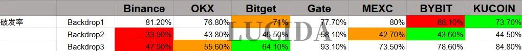 Where n CEX,i represents the number of coins on the i-th backdrop, on a given CEX, whose price increased by more than 500%; m CEX,i represents the number of coins on the i-th backdrop, on a given CEX, whose price decreased by more than 50% . This metric probabilistically measures the risk-reward balance of "how many significant drawdowns are needed to achieve a significant increase in a coin?" Simply put, it measures how many significant declines you might have to endure to achieve a significant increase. The specific calculation results are shown in the table below: