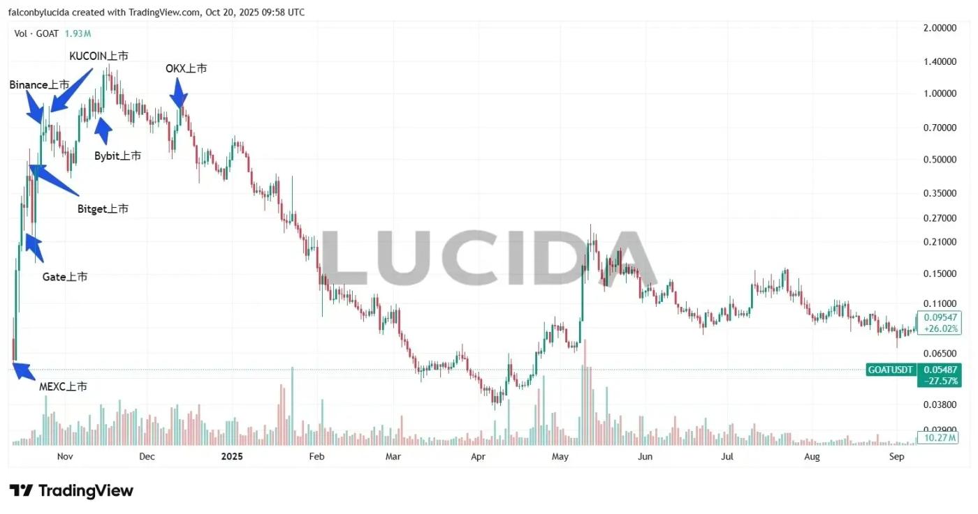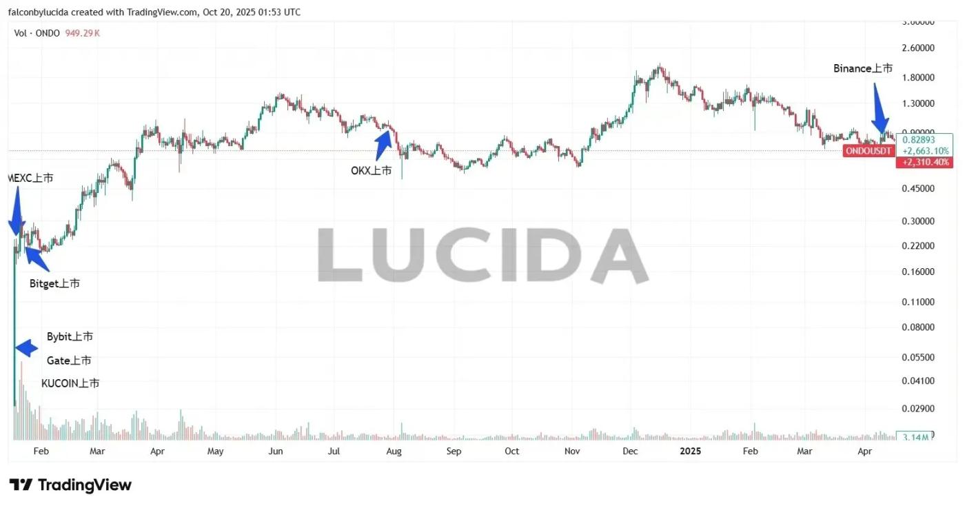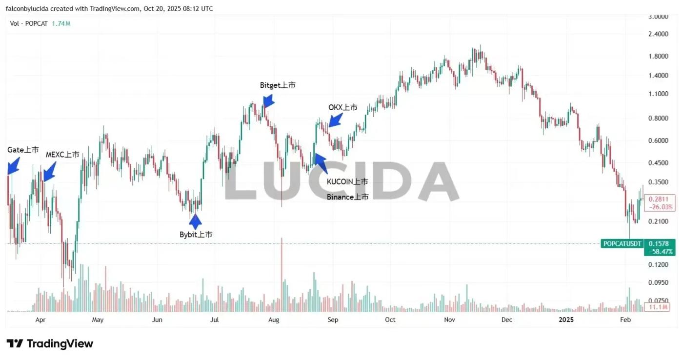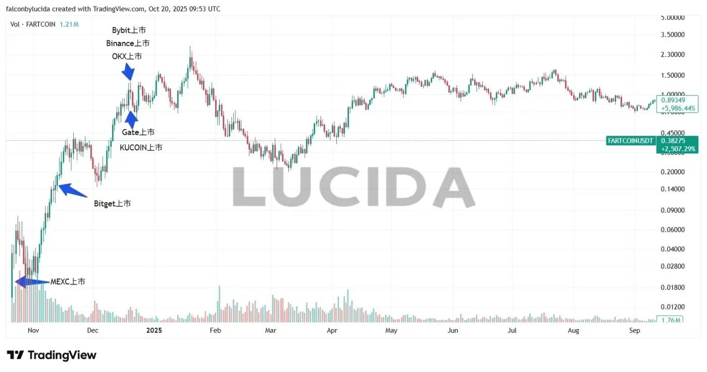 Initially launched on MEXC and Binance, they experienced a long bull run after a decline. Gate launched at a peak, Bitget launched at a low point and then saw a surge, KuCoin experienced a pullback immediately after its launch, while Bybit and OKX precisely positioned themselves before the next wave of market activity.