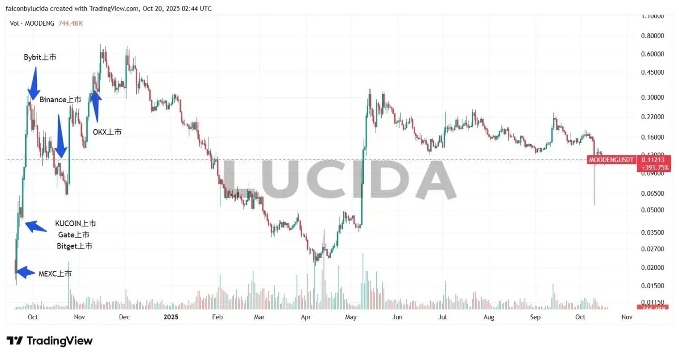 It was first listed on Binance and Gate. After a significant pullback, it was listed on Bybit, Bitget, and MEXC, precisely timing the second wave of gains. The OKX listing was nearing the end of the market.