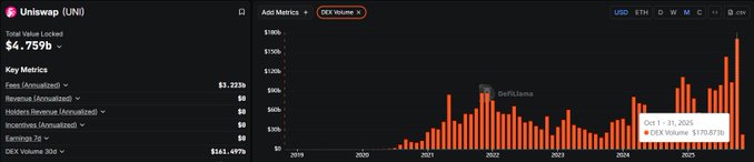 #Uniswap Trading Volume Hits All-Time High! @Uniswap has recorded its highest-ever monthly trading volume, a staggering $170.87 billion in October 2025, according to @DefiLlama.