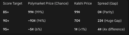 For the same question on Kalshi and Polymarket we will often see vastly different prices due to resolution criteria Who will Donald Trump talk to in November? - Zelensky (Yes) - On Kalshi trading at 47 - On PM trading at 1.7 (best asks) Pretty straightforward reason - the former counts video conferences while the latter doesn't. Time Person of the Year markets Subtle differences - Kalshi allows multiple winners (ie. if Time designates "Biden and Kamala", then both are winners, whereas Poly only credits the first-mentioned name). Kalshi allows pictures of winners to qualify, whereas PM does not. "The person must be explicitly named as the Person of the Year or pictured on the/a relevant cover if they are associated with the group/concept winning (the picture is only relevant for a natural human being winning)." - Kalshi Rotten Tomatoes Markets Pictured: Zootopia to hit >(=) x on Rotten Tomatoes on Y date PM vs Kalshi The Kalshi market specifies that the score target must be above 90. Polymarket allows Yes resolution for numbers that are “at least equal to the specified number”. Kalshi: “...(for example, a score of 75 would resolve "Above 75" as No.) Now, does this deserve a 23c gap? You could 1. Sell >= 90 on PM for 93c 2. Buy > 90 on Kalshi for 70c If >= 90 - +30 Kalshi - 7 PM = 23 If < 90 - +93 PM - 70 Kalshi = 23 If 90! - -7 PM - 70 Kalshi = -77 oh boy! You can read this as either 1. 23% chance market thinks it'll land on 90 2. people are overvaluing the chance it'll end on 90 All screenshots were gathered as of 11/28/2025. Zootopia 2 is 91% with 134 reviews (expect it to have ~300 reviews) as of today.