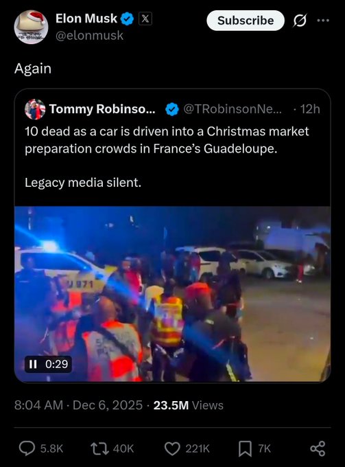 ⚡️⭕️ Elon Musk and Tommy Robinson spin a story to implicitly accuse Islam and Muslims in an unrelated event : A drunk driver injured 19 and killed 0 in Guadeloupe, french territory in the Carribean. Tommy quotes "Indian Express" as a source for his "10 dead". Elon Musk quotes "again". Nobody named Muslims anywhere, but that's what evedyone will immediately think. Social engineering. What does Elon mean by "again". He's doing a campaign against drinking and driving ?