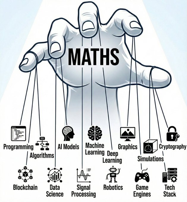 - Programming sits on maths. - Algorithms run on maths. - Every AI model is maths. - Machine learning is maths. - Deep learning is maths. - Graphics are maths. - Simulations are maths. - Cryptography is maths. - Blockchain is maths. - Data science is maths. - Optimization is