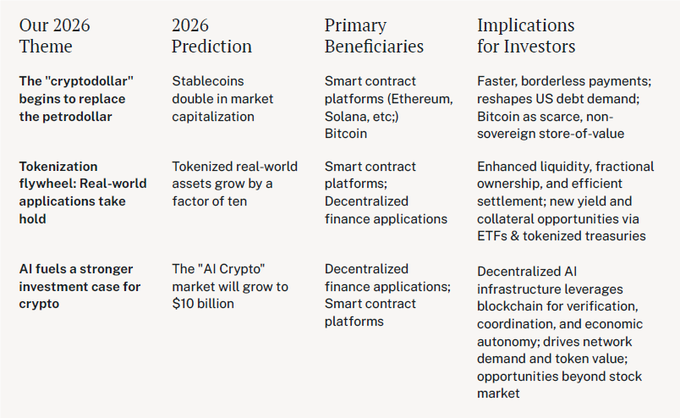 2026 crypto predictions from @hashdex... 1) Stablecoins will double in market cap 2) Tokenized real-world assets grow by factor of ten 3) "AI Crypto" market will grow to $10bil Also now recommending a 5-10% crypto allocation for most investors.