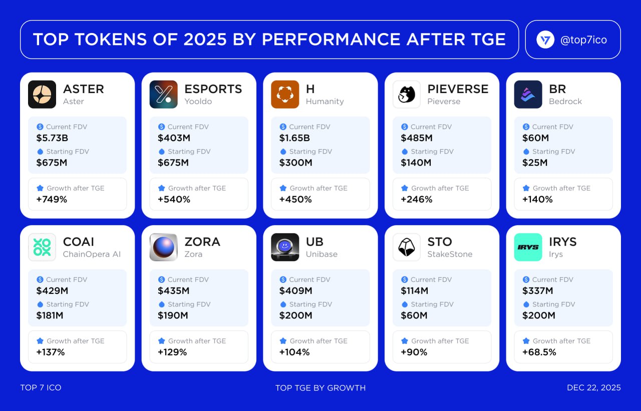 List of Top Projects that Performed Well After the 2025 TGE ✅ Most of the 2025 TGE tokens underperformed after listing, but a small number of projects significantly outperformed the market average based on conservative initial FDV estimates. ✅ List of Top Tokens by Growth Rate Since the TGE $ASTER : +749% $ESPORTS : +540% $H : +450% $PIEVERSE : +246% $BR (Bedrock) : +140% $COAI : +137% $ZORA : +129% $UB (Unibase) : +104% $STO (StakeStone) : +90% $IRYS : +68.5% ✅ Key Points 🔘 Commonalities: Relatively conservative Starting FDV + clear narrative 🔘 Projects with structural demand after the TGE, rather than short-term pumping, dominate the rankings. 🗄 Comment This data seems to rethink the conventional wisdom that "TGE = peak," but it's merely an exceptional success story. It's important to note that most 2025 tokens still underperformed after the TGE.
