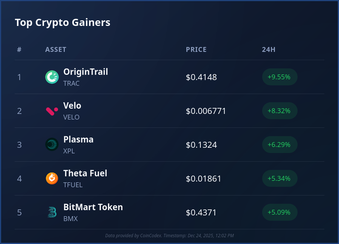 Today's top #crypto performers: $TRACK (+9.5%) $VELO (+8.3%) $XPL (+6.2%) $TFUEL (+5.3%) $BMX (+5%) Decent gains for @origin_trail, but the market overall is still struggling to make any sort of momentum.
