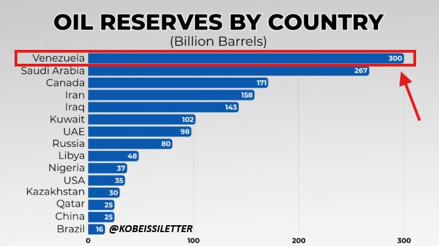 🚨 🇺🇸 🇻🇪 THE U.S. NOW CONTROLS THE LARGEST OIL RESERVE ON EARTH In case you missed what actually just happened: Venezuela holds 300 billion barrels of oil, the largest proven reserves in the world. And now, per Trump, large U.S. oil companies are moving in to stabilize and rebuild the industry post-Maduro. Translation: the U.S. just went from sanctioning Venezuela to effectively running it, securing direct access to the most valuable energy stockpile on the planet. It’s officially a geopolitical game-changer. While China and Russia were busy propping up a narco-dictator, America just flipped the board. Source: @KobeissiLetter