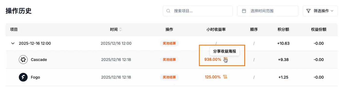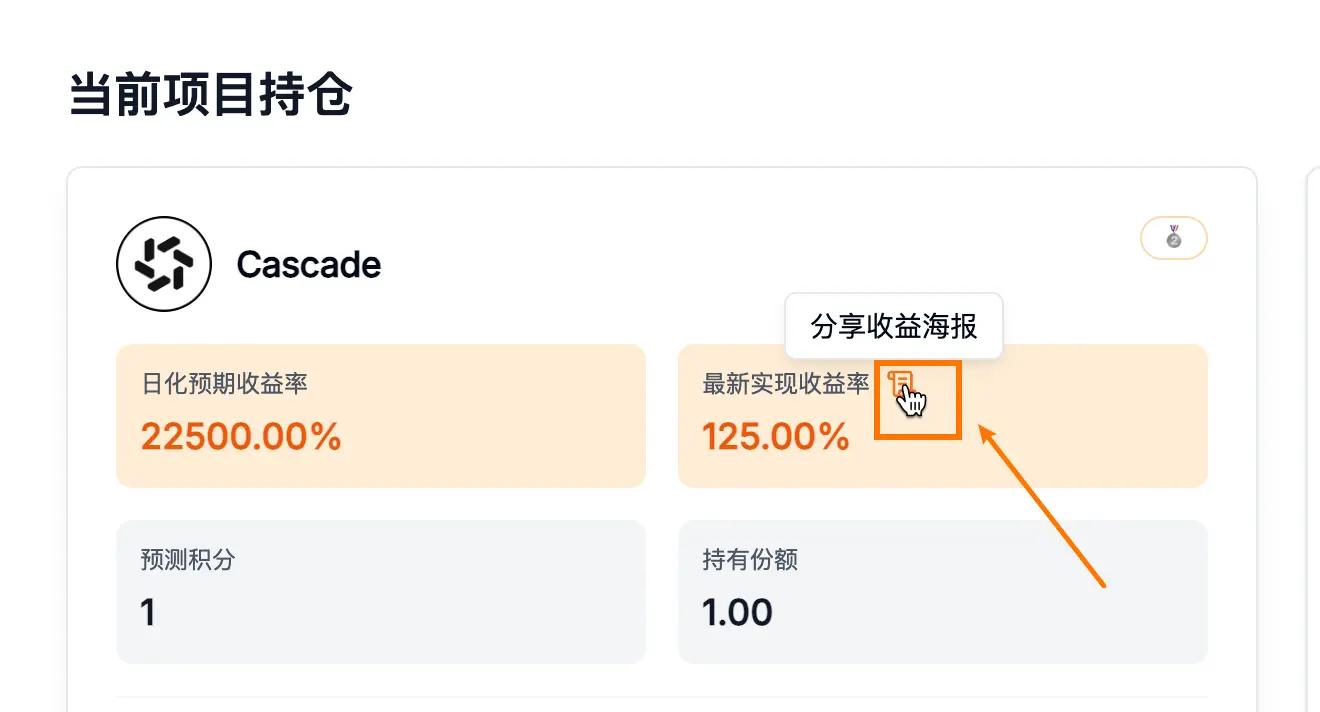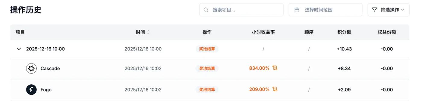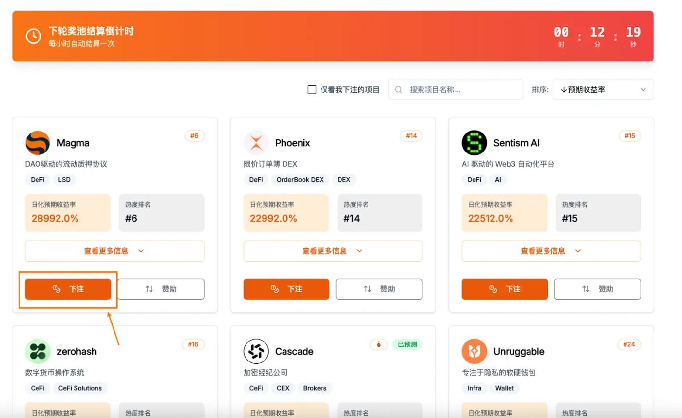 3. Points Rewards: Every hour, the system distributes points rewards to the top 50 projects on the popularity list, forming a "prize pool." If the project you bet on successfully makes it onto the list, you will receive a corresponding proportion of points from the prize pool based on your "equity share" in that project. This is like identifying and investing in a promising stock in advance; whenever it performs well (ranks high), you, as a "shareholder," immediately receive dividends.