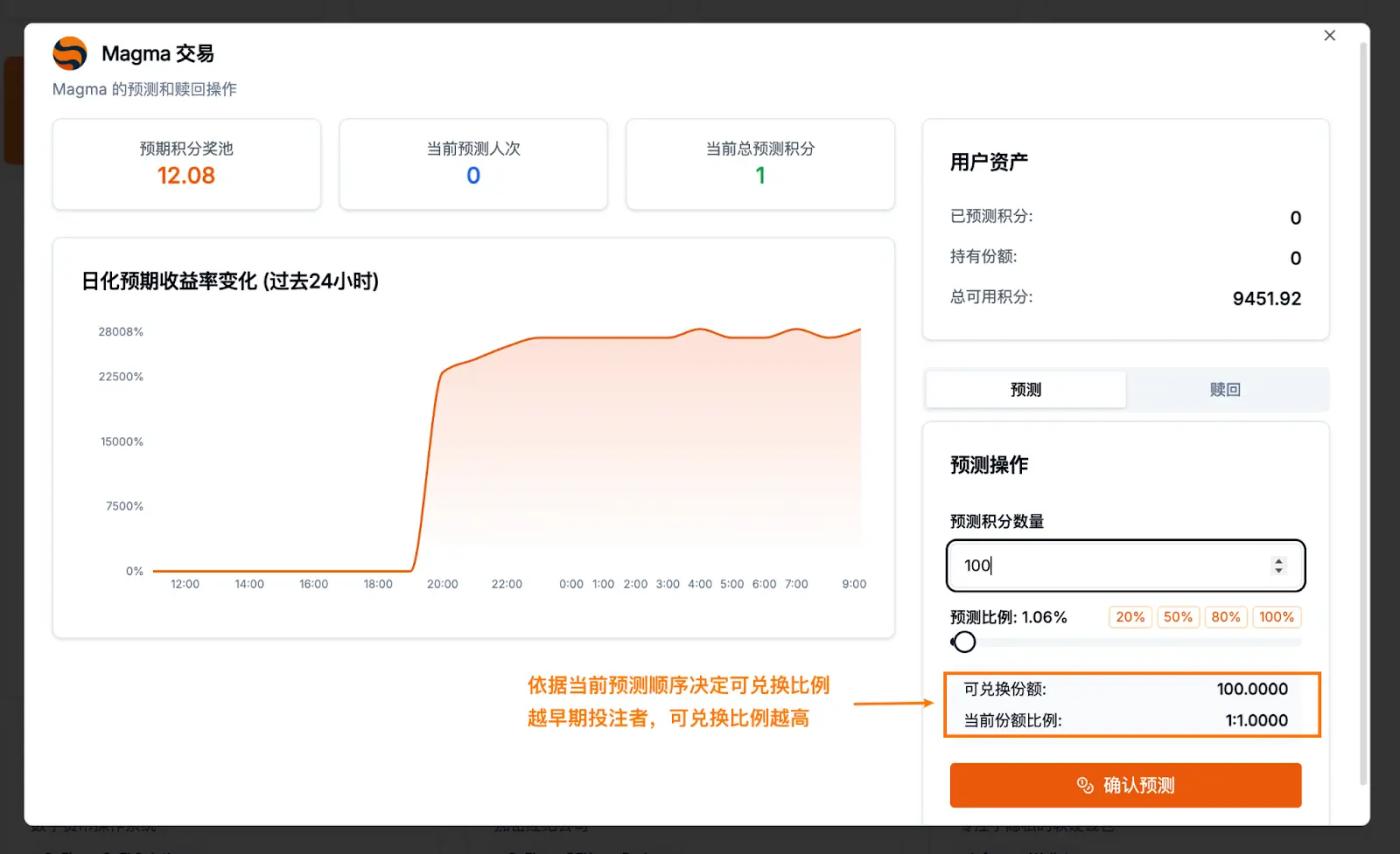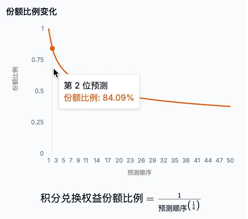 2. Early Bird Incentive Mechanism: The earlier you bet, the higher the exchange rate. For example, the first user to bet on Project A can exchange 100 points for 100 shares; while the second user, with the same 100 points, can only exchange for 84.09 shares. This encourages early discovery of value and simulates the "early bird advantage" in the real market.