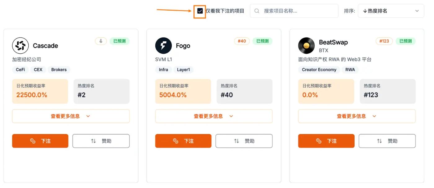 1. Filter in the prediction hall: Enter the "Points Prediction" page, check "Only view projects I have bet on" to quickly focus.