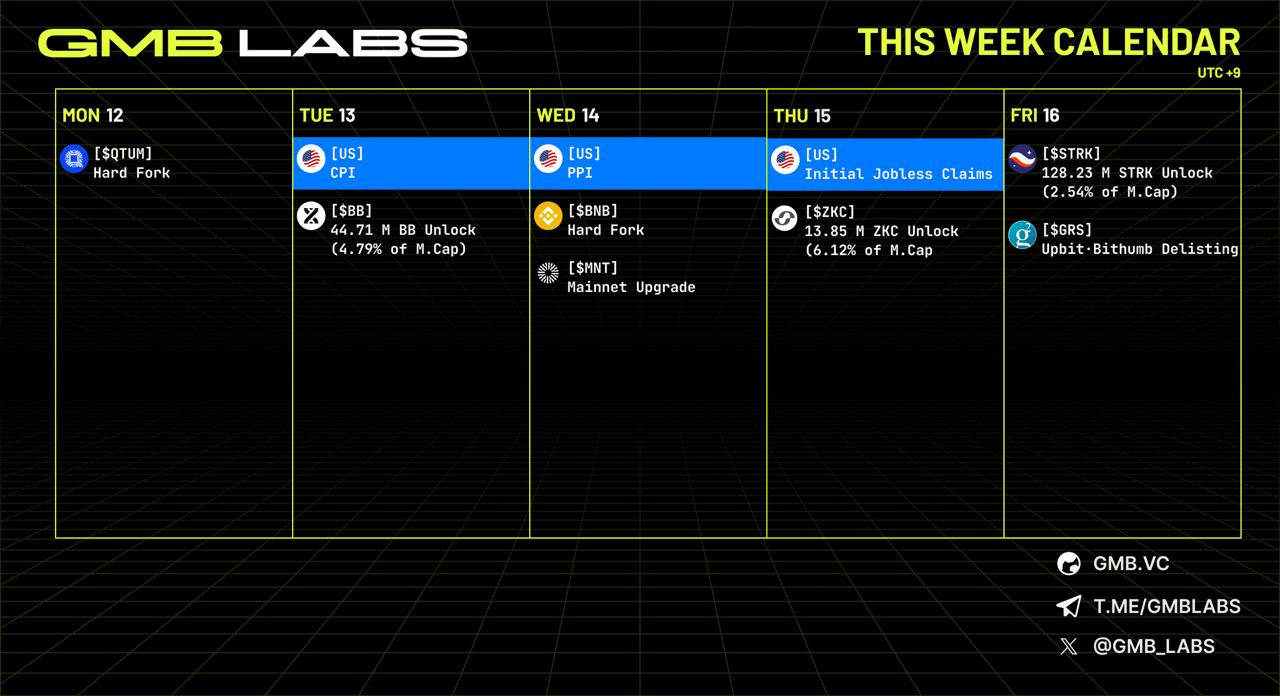 ✅ GMB LABS Calendar 🟢12th $QTUM Hard Fork 🟢13th US CPI 🟢14th US PPI 🟢16th $GRS Upbit and Bithumb delistings Please note this when investing.