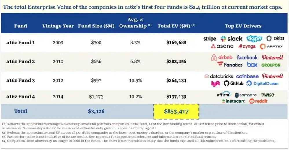 As mentioned earlier, peers have questioned whether the combined valuation of the first four a16z funds needs to reach $240 billion to meet the target. In fact, the total combined valuation of a16z funds 1-4 (calculated based on the valuation at the time of exit or the latest post-investment valuation) has reached $853 billion[7].