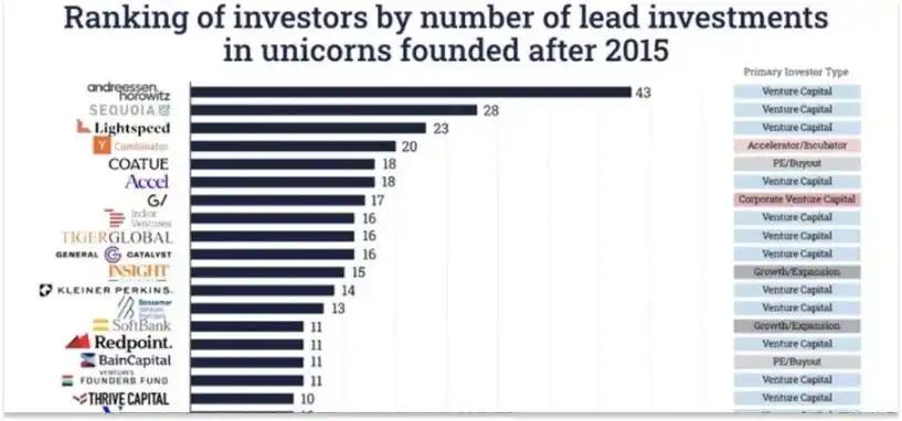 Since 2015, a16z has invested in more unicorn companies at an early stage than any other investor, and the gap between it and the second-ranked investor (Sequoia Capital) is comparable to the gap between the second and twelfth ranked investors.