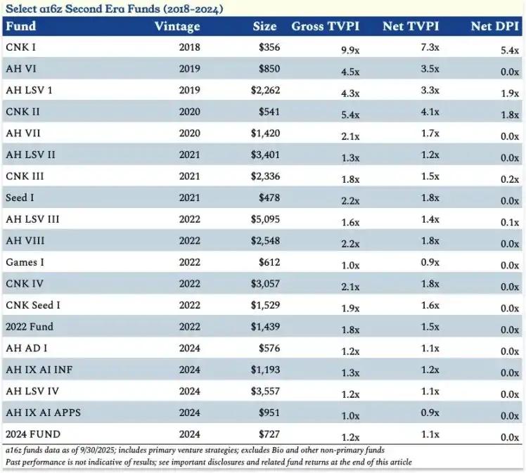Core performance data of some funds from a16z during 2018-2024 (Phase II).