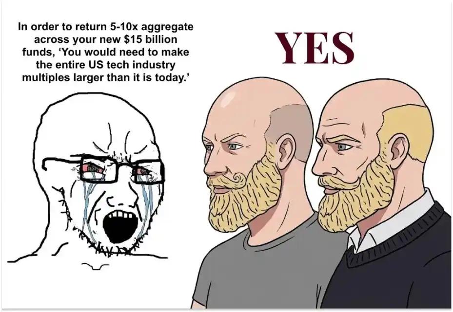 At this moment, you might imagine this scenario: an analyst from a rival venture capital firm messages journalist Tad Friend, saying, "To achieve a combined 5-10x return on these two new $15 billion funds, 'you'd have to expand the entire U.S. tech industry several times over.'"
