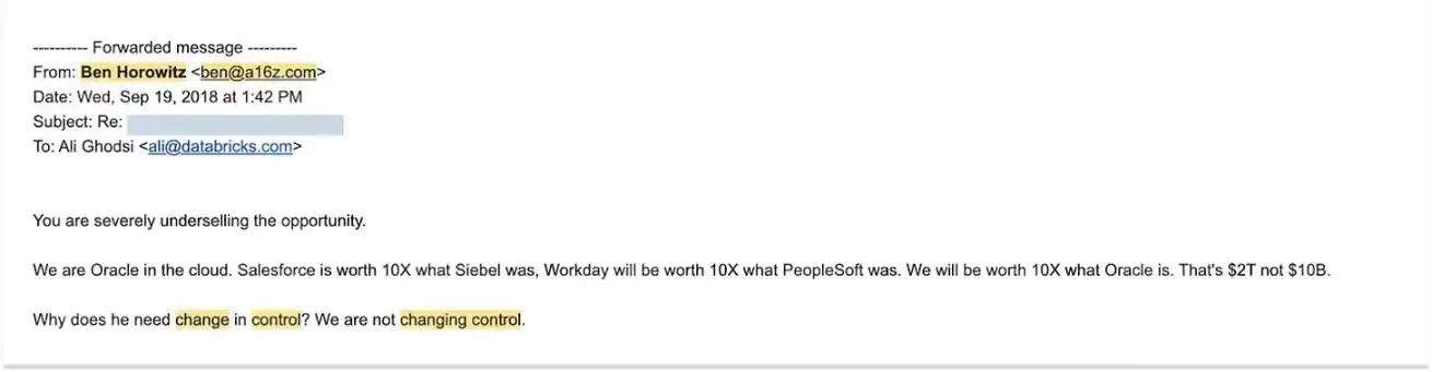 This is probably one of the most impactful corporate emails ever, especially considering that at the time, Databricks had a revenue run rate (annualized revenue) of $100 million and a valuation of only $1 billion; now, the company's revenue run rate has exceeded $480 million and its valuation has reached $134 billion.