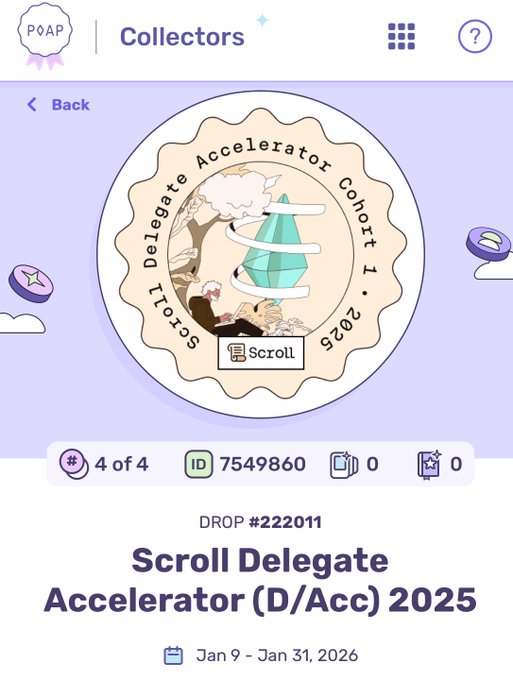 Calling Scroll d/acc Cohort 1 Alumni! We've prepared a commemorative POAP to celebrate your participation in the accelerator. Thank you for helping develop a more competent and diverse delegate base for Scroll DAO. 🎖️ go mint it 🤝