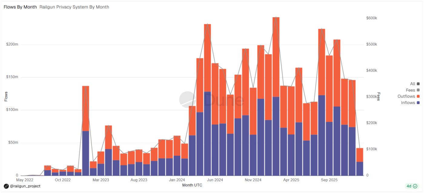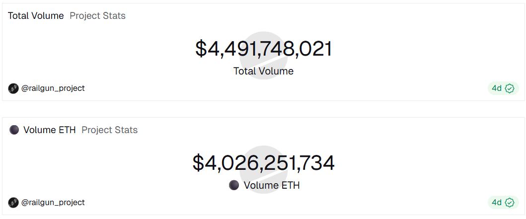 Dune data shows that Railgun's fund usage has remained active since 2022, with a significant increase in activity, especially after Ethereum gas costs dropped substantially in 2024. To date, the cumulative transaction volume has reached $ 4.49 billion , of which approximately $4.03 billion is worth of ETH.