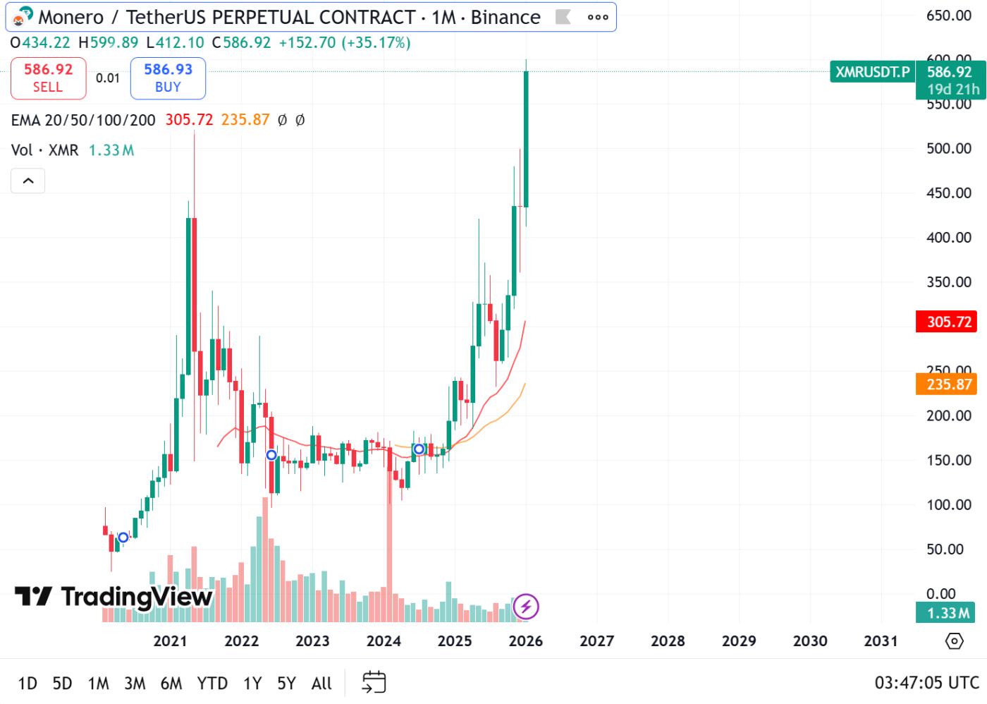 On January 13th, the price of Monero (XMR) broke through $650. This round of gains, which began at the start of 2024, represents an increase of over 500% . However, more symbolic than the price increase itself is that this marks the first time in eight years that XMR has effectively broken through the historical high of the 2017 bull market cycle.