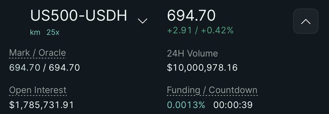 >$10m vol + >$1.7m OI on US500 by @markets_xyz in its opening hours. Hyperliquid