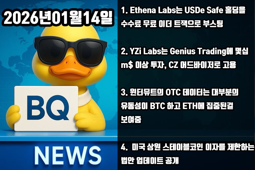 โ๏ธ (2026.01.14) Summary of major cryptocurrency news and comments Have a great day! 1๏ธโฃ Ethena Labs Boosts USDe Safe Holdings with Fee-Free Ether Transactions ๐ (Summary) - The Safe Foundation is considering USDe adoption - Partnership announced on Tuesday - Safe Wallet supports reduced USDe transfer fees and point boosting on the Ethereum mainnet - Safe currently manages approximately $6.6 billion in stablecoins as infrastructure - Safe accounts will now receive Esena points at a 10x multiplier โ๏ธ (Personal Comment) - Esena is completely focused on distribution. - Their strategy is to simply distribute USDe everywhere and grow from there. - I personally agree with their approach, but - I think it's time to focus on token-related fee switches and other issues, but they haven't... Original Link (www.theblock.co/post/385396/et... 2๏ธโฃ YZi Labs has invested tens of millions of dollars in Genius Trading. Investment, Hired as CZ Advisor ๐(Summary) - YZi Labs Makes a Major Investment in Genius Trading - CZ Joins as an Advisor - Genius Trading is Building a Privacy-Based Decentralized Trading Platform - Discussing Binance's On-Chain Alternative - Plans to Support 10+ Chains, Privacy, Bridging, Trading, and More with a Trading Terminal โ๏ธ (Personal Comment) - It feels like an all-in-one trading platform that covers whales, institutions, and the general public. - It feels like CZ's next project? - I haven't used it yet, so I can't say for sure, but it looks fun. - Anyway, I respect CZ. It's really cool that he keeps working and trying new things even after making so much money. Original Link (www.theblock.co/post/385366/yz... 3๏ธโฃ Wintermute's OTC data shows that most liquidity is concentrated in BTC and ETH. ๐ (Summary) - Wintermute says crypto liquidity won't be dispersed across various markets in 2025. - He mentions that since last year, most liquidity has been concentrated in Bitcoin and Ethereum, with no movement elsewhere. - He states that while the number of coins has increased, most liquidity is concentrated in a few large market cap coins. - He points out that altcoin rallies are also becoming shorter each year, with the 2025 rally lasting only about 19 days. - This contrasts with the 2024 altcoin rally, which lasted an average of 61 days. โ๏ธ (Personal comment) - Well, you can see this just by looking at the market. - It seems like we're in an era where even OTCs are mostly focused on Bitcoin and Ethereum. - To put it positively, there's still plenty of room for altcoins to rise. - To put it negatively, is there currently no interest from institutions or OTC whales outside of Bitcoin and Ethereum? Original link (www.theblock.co/post/385332/wi... 4๏ธโฃ US Senate Releases Update on Bill to Limit Stablecoin Interest ๐ (Summary) - US Senators add a clear line that simply holding stablecoins does not entitle you to interest. - They say institutions and digital asset providers should not be allowed to pay interest simply by holding them. - However, interest earned through staking, liquidity provision, etc. is permitted. - Currently, stablecoin interest is the most contentious topic between banks and crypto. โ๏ธ (Personal Comment) - Currently, regarding stablecoin interest payments, - Banks seem to be winning in the US. - Naturally, if banks start allowing this, - they will fight tooth and nail to stop it, as they have no need to hold money in banks. - Personally, I see this as an inevitable trend, but I suspect there will be significant opposition from banks for now. - My guess is that this will naturally happen in the next few years. Original Link (www.theblock.co/post/385303/se... Hearts and likes are a great help to BQ content ๐คฉ #CryptoNews #CoinNews #Cryptonews #BTC #ETH