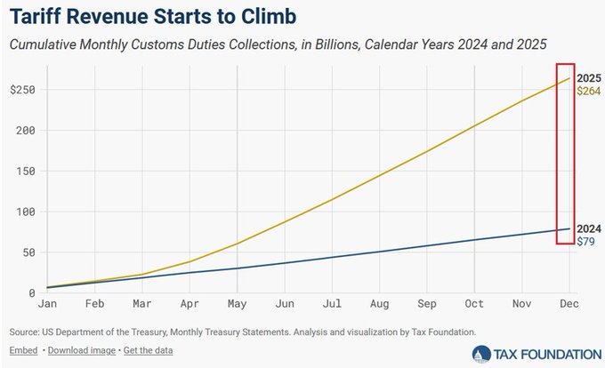 BREAKING: US tariff revenue surged +234% YoY in 2025, to a record $264 billion, up +$185 billion compared to 2024.