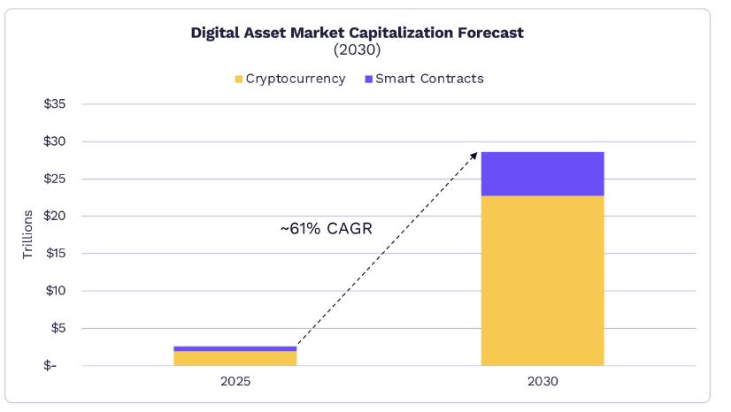 By 2030, the market capitalization of smart contracts could grow at a rate of 54% per year to reach approximately $6 trillion, generating approximately $192 billion in annual revenue at an average fee rate of 0.75%.