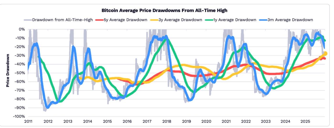 In 2025, the decline in Bitcoin's price relative to its all-time high narrowed, and its volatility decreased as Bitcoin's role as a safe-haven asset grew. Looking at timeframes of 5 years, 3 years, 1 year, and 3 months, Bitcoin's pullback in 2025 was not significant compared to historical pullbacks.