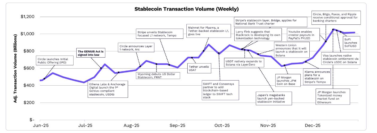 In December 2025, the adjusted 30-day moving average of stablecoin transaction volume was $3.5 trillion, 2.3 times the total volume of Visa, PayPal, and remittances.