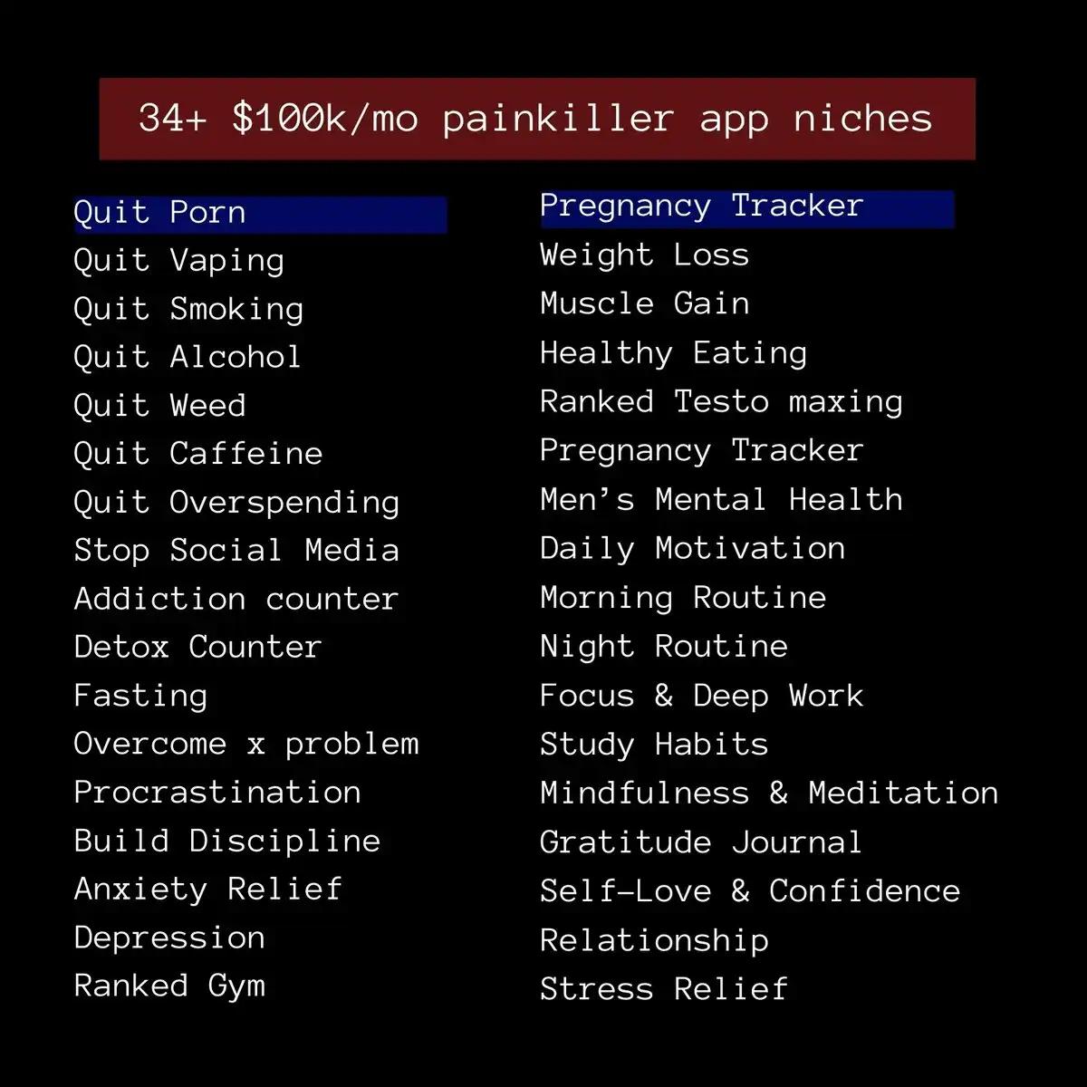 (34 niche application areas with over $100,000 in revenue over 34 months: quitting pornography, quitting e-cigarettes, quitting smoking, quitting alcohol, quitting marijuana, quitting caffeine, quitting excessive consumption, quitting social media, withdrawal counters, detox counters, fasting, overcoming sexual problems, overcoming procrastination, cultivating self-discipline, relieving anxiety, depression, gym rankings, pregnancy tracking, weight loss, muscle gain, healthy eating, maximizing testosterone, pregnancy tracking, men's mental health, daily motivation, morning habits, nighttime habits, focus and deep work, study habits, mindfulness and meditation, gratitude journaling, self-love and self-confidence, interpersonal relationships, stress relief)