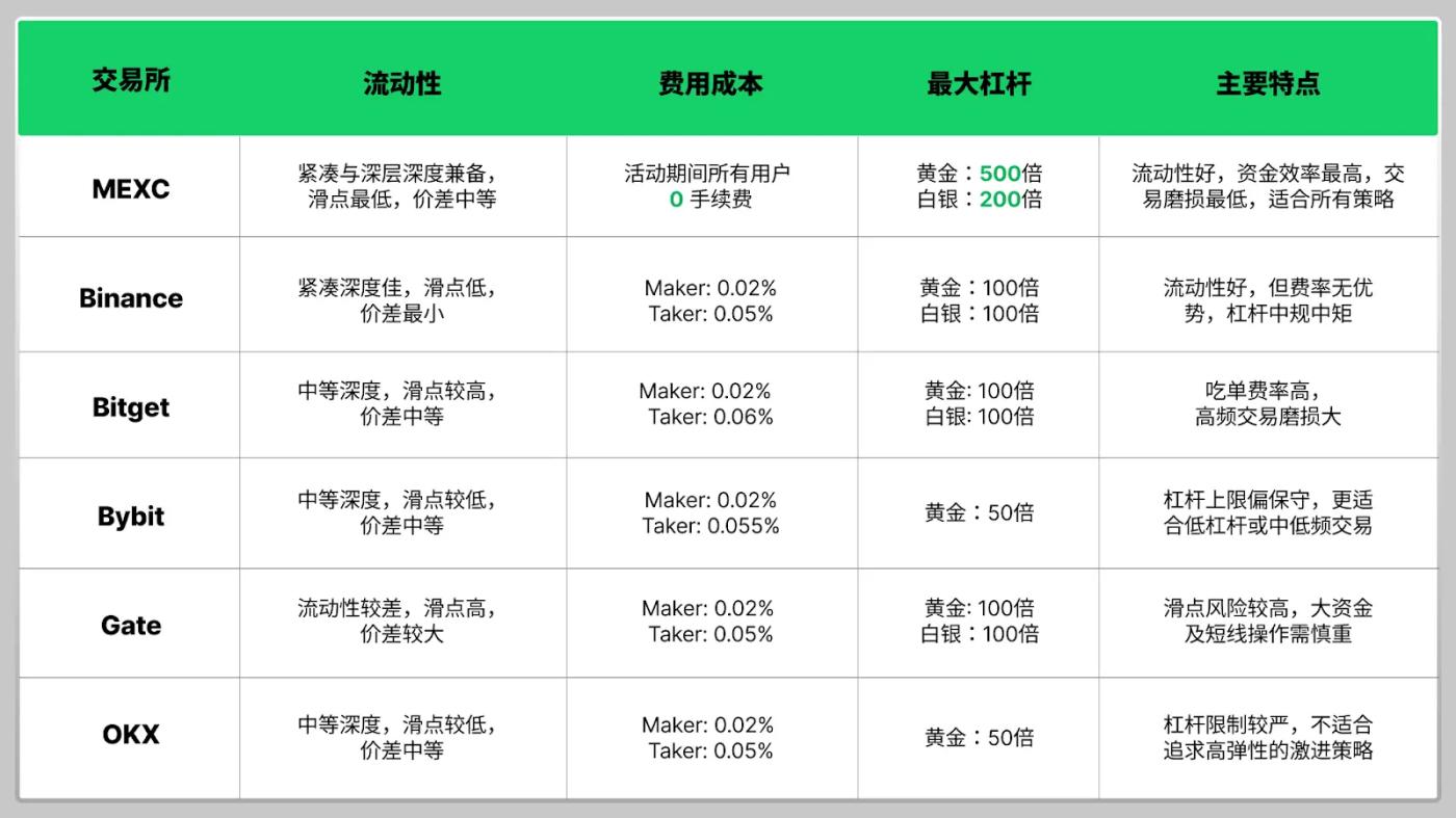 Let's look at another important friction cost—slippage. Based on a 100,000 USDT order, MEXC's slippage loss is only 0.44 USDT, significantly lower than other platforms, such as Binance at 2.39 USDT, Bitget at 2.85 USDT, and Gate at a whopping 7.31 USDT.