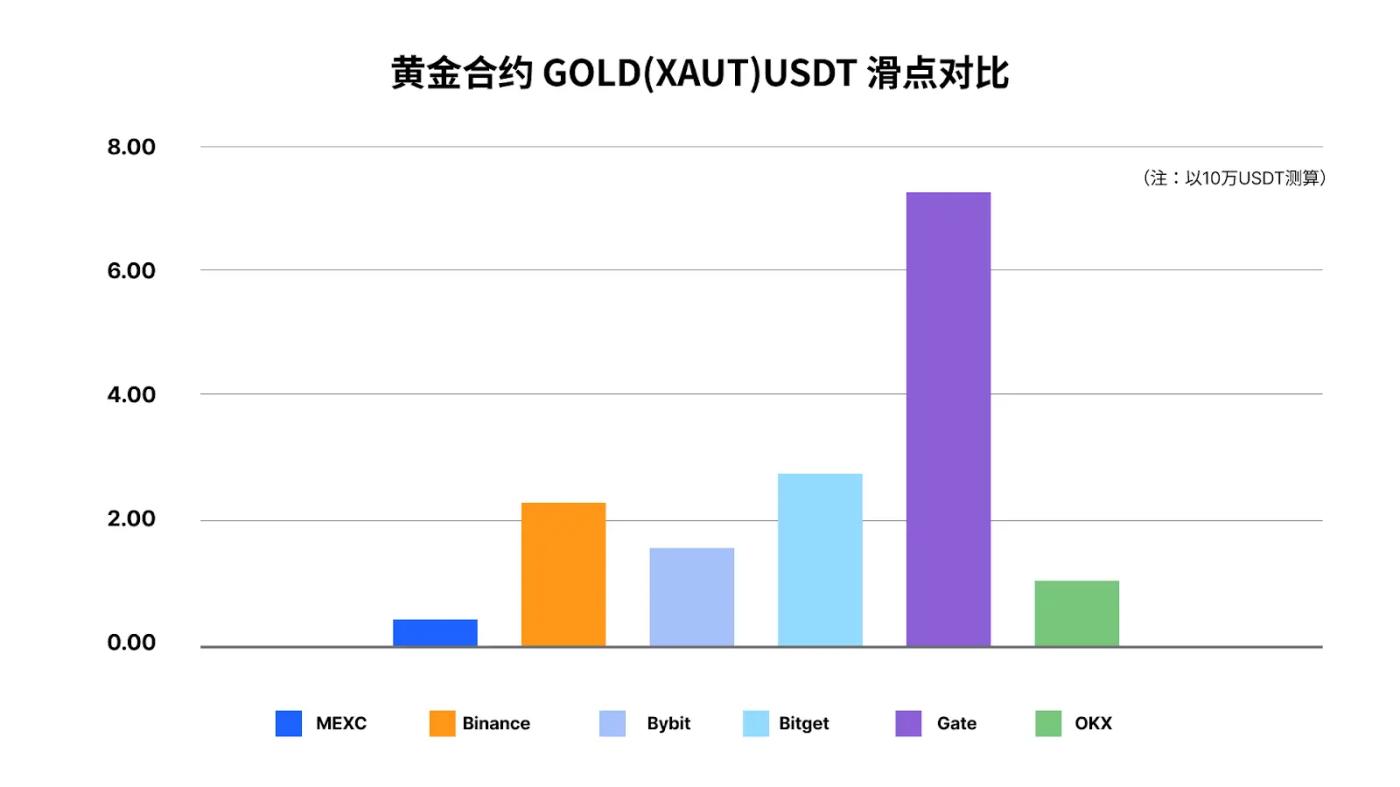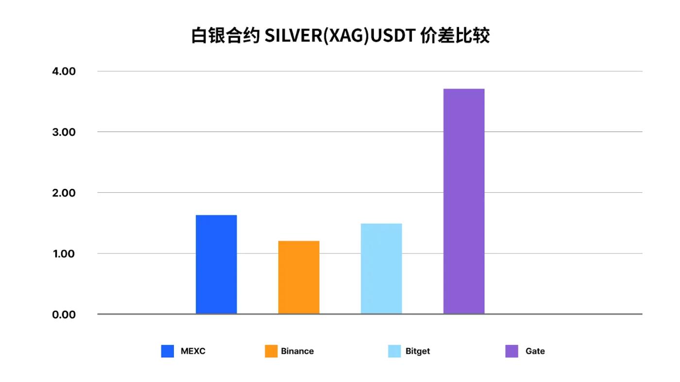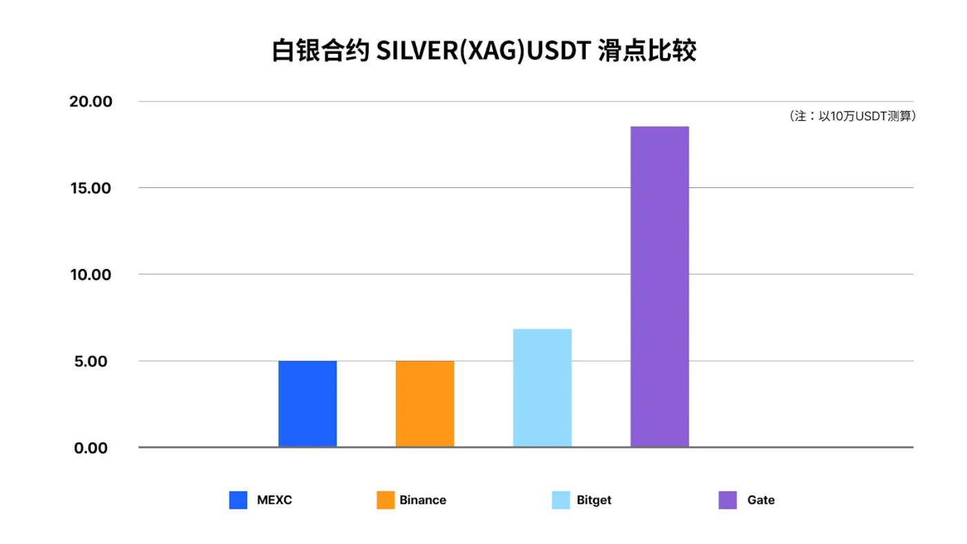 In slippage testing, taking a 100,000 USDT order size as an example, MEXC and Binance had the lowest slippage losses, approximately 5 USDT; Bitget had approximately 7 USDT, and Gate had approximately 18 USDT. This indicates that on higher volatility instruments like silver, MEXC offers more stable execution quality and lower implicit transaction costs.