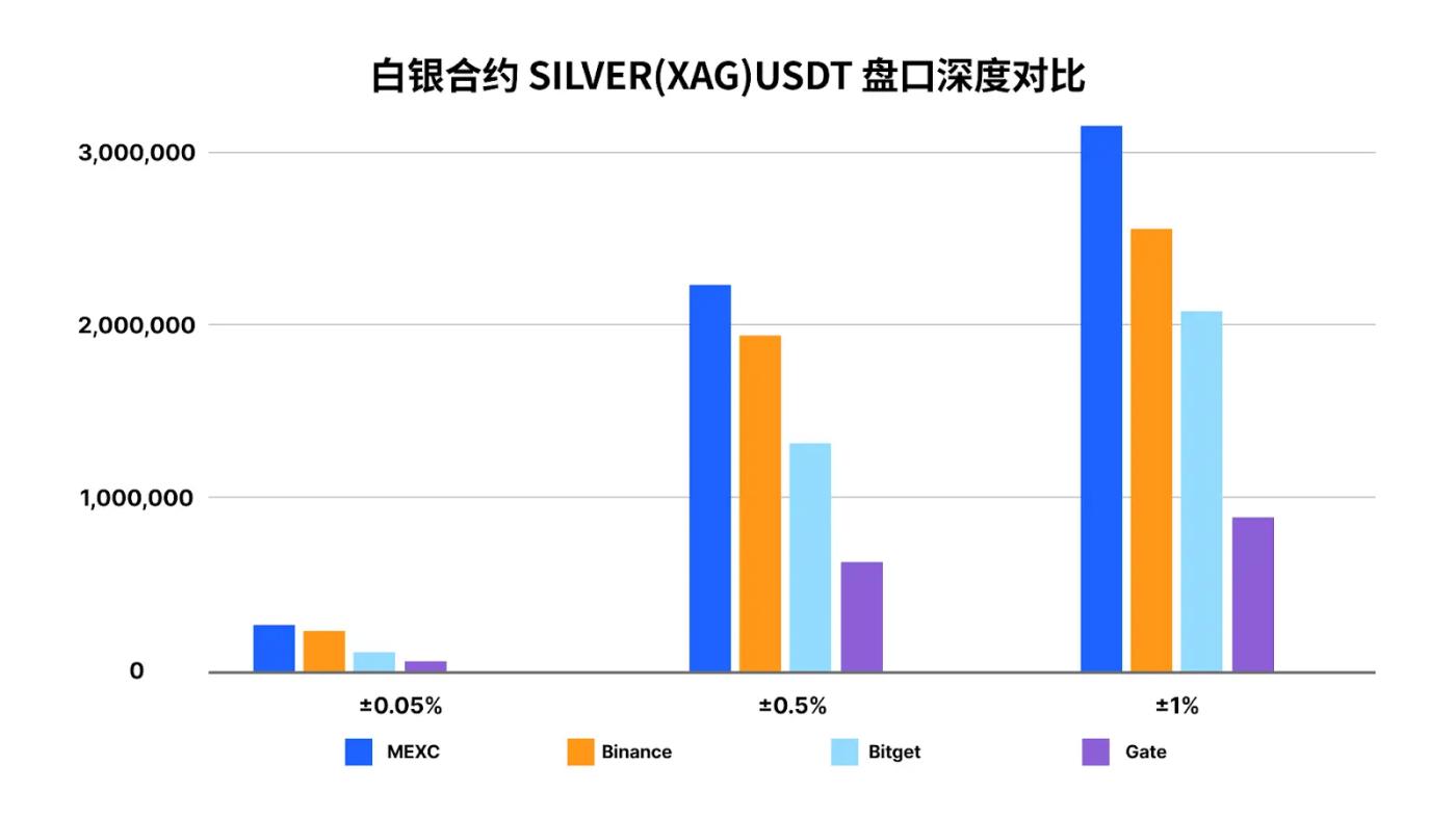 Compared to gold, silver typically exhibits higher volatility and is more prone to thinning of the order book and increased slippage during volatile market conditions. In the ±0.05% depth test, which is the most critical indicator of order book density, MEXC ranks first, with its order book volume exceeding not only Binance but also Bitget and Gate. For scalping and high-frequency trading, orders on MEXC are more likely to be matched closer to the execution price, thus reducing impact costs.