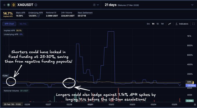 Whether You’re a Bear or Bull, Boros Gives You More Gains (Fixed Funding Guide) In the past few weeks, we’ve seen wild swings in crypto funding rates. From XRP rates dropping to -90%, to XAU going to 1,100% APR - even if you timed the market perfectly, funding ate into your profits! But with Boros, you don’t have to worry about losing gains to funding rate spikes. Just remember: Long rates on Boros + long perp position = you pay fixed funding on your long Short rates on Boros + short perp position = you receive fixed funding on your short! It’s literally that simple. Long/short YU to your perp position at a 1:1 ratio, and you’ve unlocked fixed funding. If you did this on XRP at the start of our XRPUSDC-Hyperliquid market… You locked in 8% fixed rates + made money on the Implied APR decreasing. All with no losses to negative funding rates! Plus, XRP went from $1.9 to $1.4 - so you received yield while profiting from your short with Boros. And if you were shorting XAG/Silver the past 2 weeks... Using Boros would have given you fixed rates from 25-30%, protecting you from negative funding payouts today! TL;DR - Use Boros for fixed funding on your perp positions to reduce funding rate costs. For an in-depth guide, check out the thread below:
